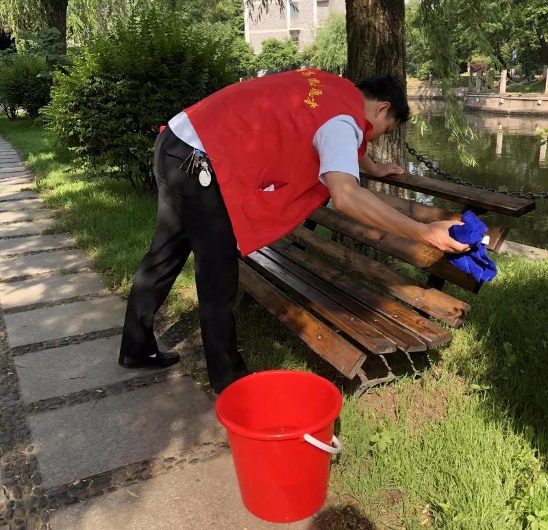 “抹布隊(duì)”沿著河岸,將16余處休閑座椅、長(zhǎng)廊欄桿擦得锃亮,廊內(nèi)小憩的業(yè)主們紛紛為他們點(diǎn)贊;