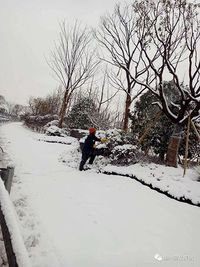 為確保新植苗木的安全,特別是造形樹不被積雪壓壞,承建申嘉湖高速湖州東互通區(qū)及申申高速連接線湖鹽公路段綠化提升工程的湖州中恒園林建設有限公司,26日一大早就派出施工人員,奔赴互通區(qū)現(xiàn)場,用竹竿拍除樹枝上的積雪,確保整個工程的綠化水準,提升湖州東大門的形象品質。