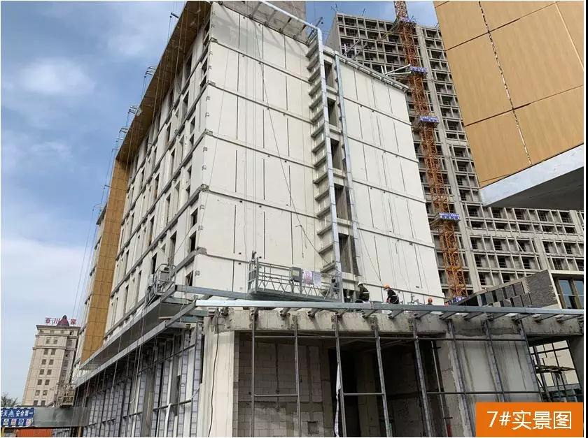 7#公寓已結(jié)頂,幕墻工程施工中,公寓內(nèi)及公共部位裝修中,正處于裝飾工程施工階段。